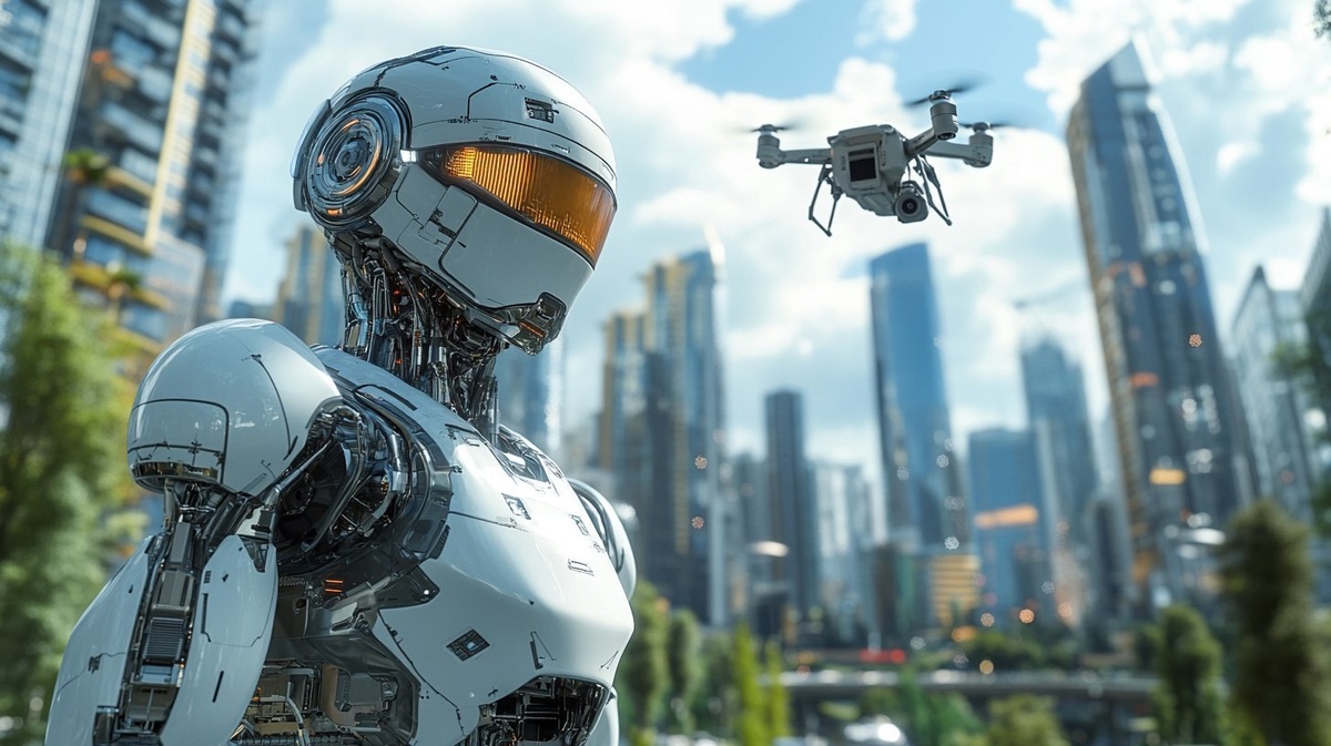 Создано на основе запроса: A humanoid robot with a sleek, futuristic design stands in an urban park setting. In the background, modern skyscrapers rise against a partly - cloudy sky. A drone with a camera hovers nearby, suggesting a scene of technological coexistence in a city environment. --- Автоперевод: Гуманоидный робот с гладким, футуристическим дизайном стоит в городском парке. Красиво получилось? 🤔 https://dzen.ru/id/65c0c65c86e4f837c27b24d7 #ИИ #AI #нейросеть #midjourney #art