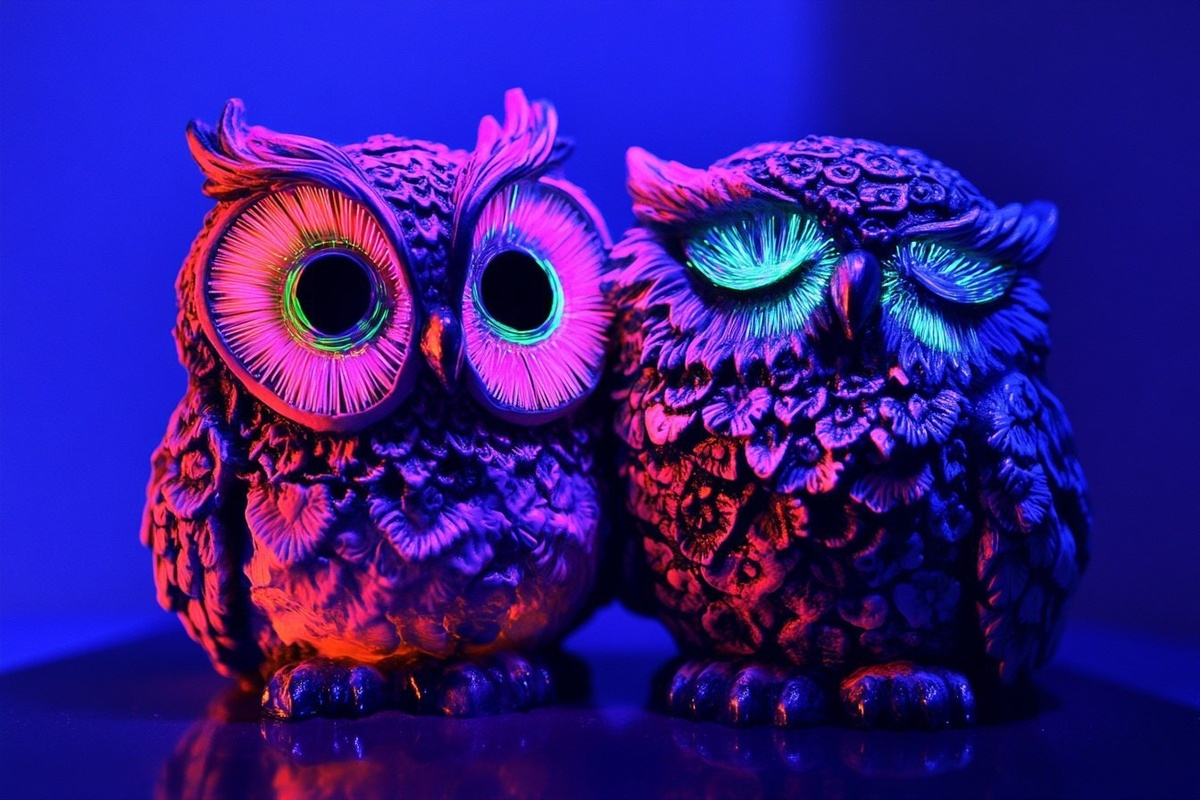 Создано на основе запроса: A pair of owls, one sad the other happy, made from colorful fluorescent resin, emitting vibrant neon colors under