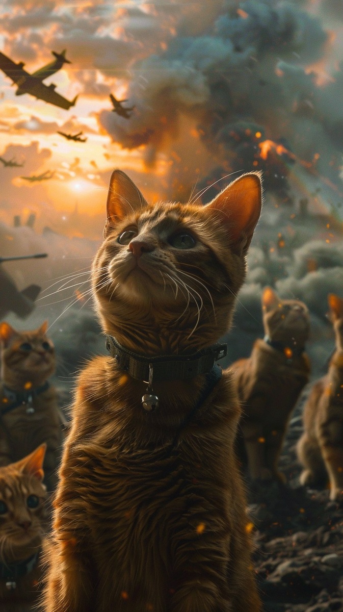 Создано на основе запроса: A cinematic battlefield at sunset, with a group of heroic orange tabby cats in military uniforms standing at attention and saluting. The background features a war-torn landscape, with tanks and military vehicles in the distance, smoke rising from the ground, and distant explosions lighting up the horizon. Soft beams of light break through the dark clouds, casting an ethereal glow over the scene. The atmosphere is intense, solemn, and heroic, creating a sense of duty and sacrifice. Ultra-realistic, movie poster style --- Автоперевод: Кинематографическое поле битвы на закате, с группой героических кошек оранжевого табби в военной форме, стоящей с вниманием и приветствием. Классно выглядит? 🤔 https://dzen.ru/id/65c0c65c86e4f837c27b24d7 #ИИ #AI #нейросеть #midjourney #art