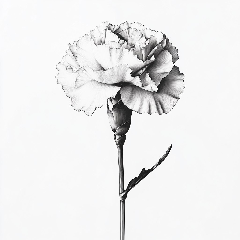Создано на основе запроса: simple black and white fine line realistic photo of a carnation flower, high contrast 4k resolution, white