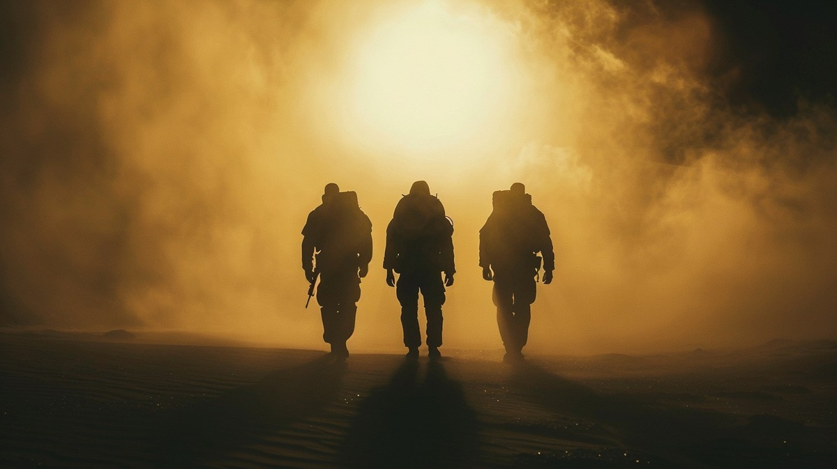 Создано на основе запроса: A three shiloutte of marine walking on the sand of desert. The sun is gone, pure dark background. cinematic lighting, gritty atmosphere, ultra-realistic, 35mm film, shallow depth of field, high contrast, moody, horror