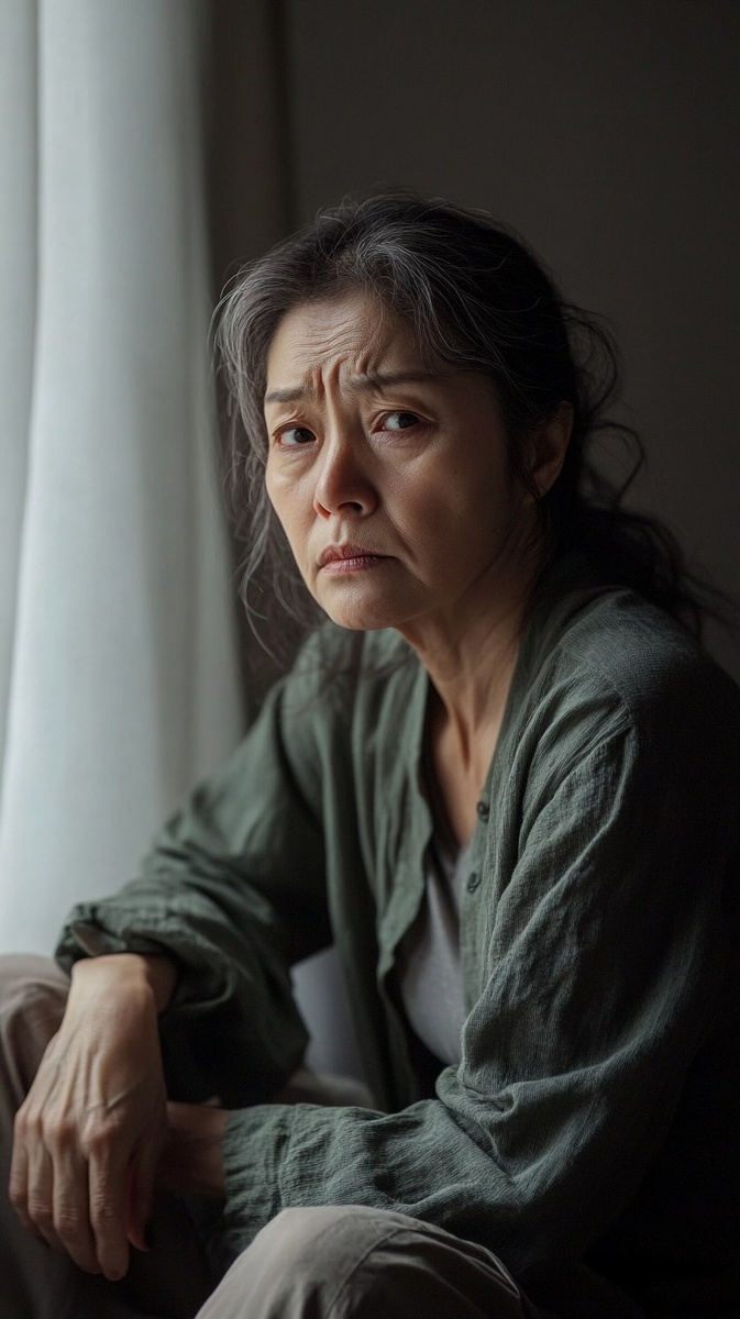 Создано на основе запроса: A realistic photo of a middle-aged Korean woman sitting on the edge of a bed or sofa, slouched forward with a