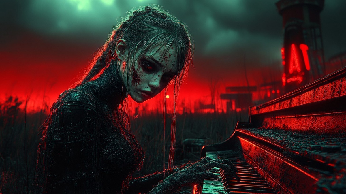 Автоперевод: Темный сюрреализм, гниющий зомби, играющий на пианино, танцующий зомби Мэрилин Монро, заброшенный карнавал в сумерках, освещенное, капризное небо, колыбельная горе