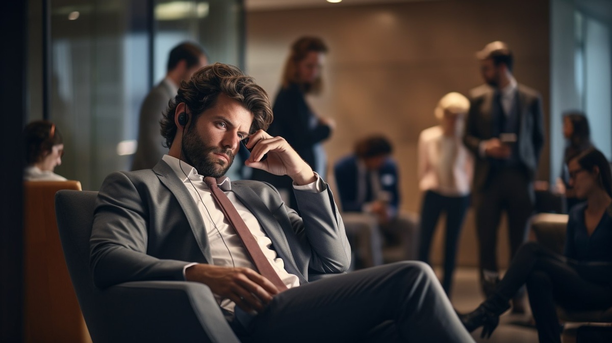 Создано на основе запроса: A man sitting in a formal meeting room where everyone is attentively listening. He leans back with legs stretched out, wearing earphones and looking at his phone. Others around him sit upright and focused. His posture is relaxed and indifferent, clearly ignoring the group setting. Realistic documentary photo, cold ambient lighting, office environment, no faces shown, emphasis on individual selfish behavior in collective space, style photographic --- Автоперевод: Человек, сидящий в официальной комнате для встреч, где все внимательно слушают. Как тебе иллюстрация? 🤔 https://dzen.ru/id/65c0c65c86e4f837c27b24d7 #ИИ #AI #нейросеть #midjourney #art
