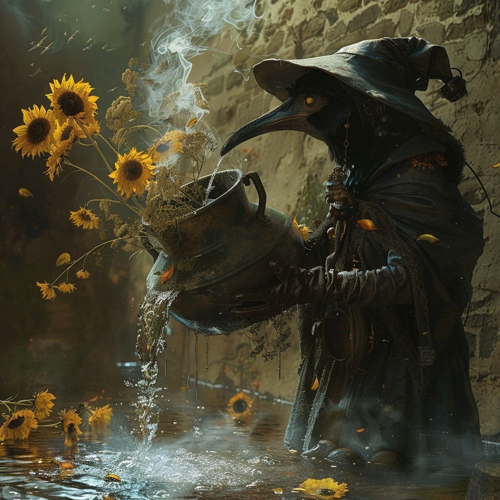 Создано на основе запроса: a realistic plague doctor pouring sunflowers that move like water out of an old vase and the sunflowers slowly disappear into smoke as they hit the river