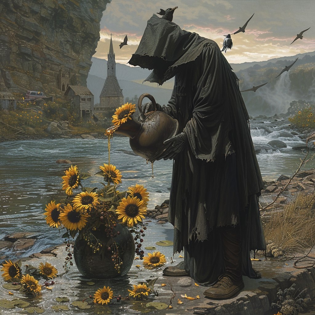 Создано на основе запроса: a tall realistic human plague doctor pouring sunflowers out of an old vase from a high surface into the river