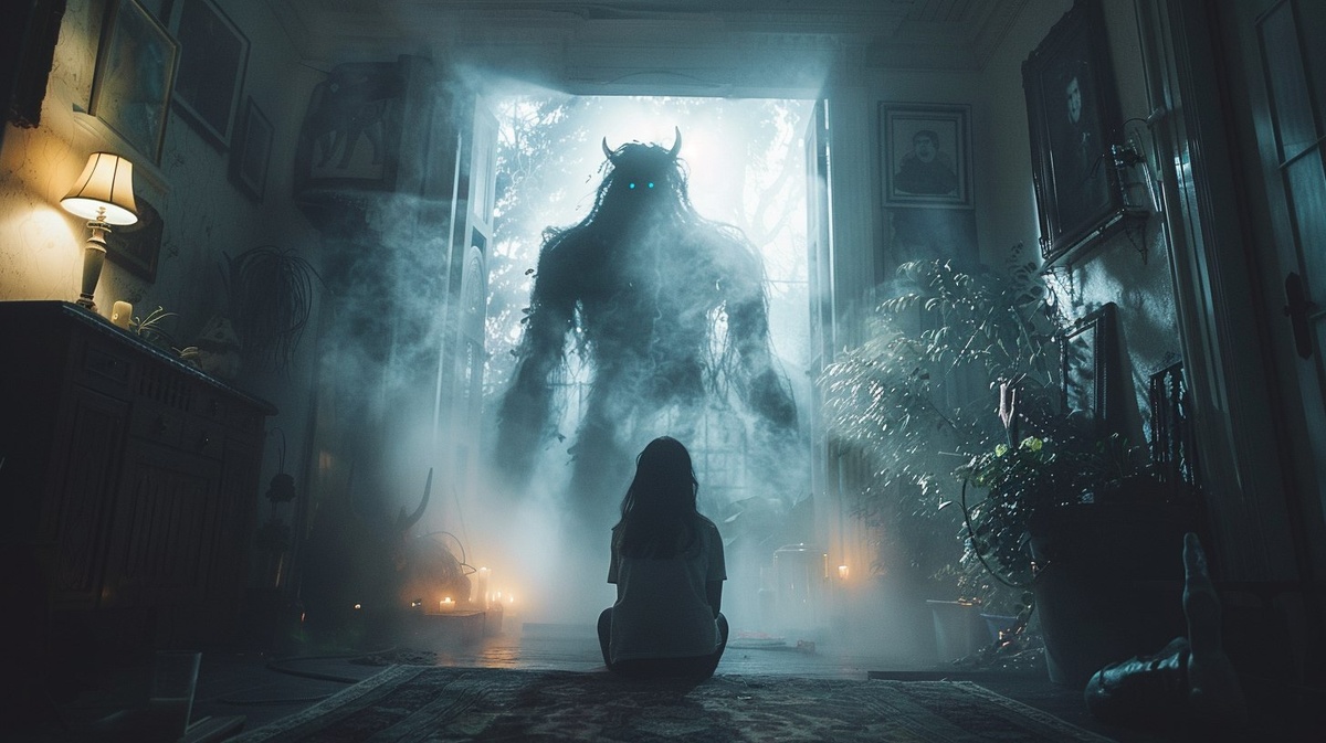 Создано на основе запроса: Surreal cinematic image seen through a phone screen: a dreamlike woman enveloped in layers of soft, illuminated fabric, her figure implied through shifting light and shadow. The scene is bathed in candlelight and deep atmosphere. In the background, barely discernible, a tall humanoid silhouette with horns and glowing eyes watches silently from the gloom --- Автоперевод: Сюрреалистическое кинематографическое изображение, увиденное на экране телефона: сказочная женщина, охваченная слоями мягкой, освещенной ткани, ее фигура подразумевается через смещение света и тени. Отлично получилось? 🤔 https://dzen.ru/id/65c0c65c86e4f837c27b24d7 #ИИ #AI #нейросеть #midjourney #art