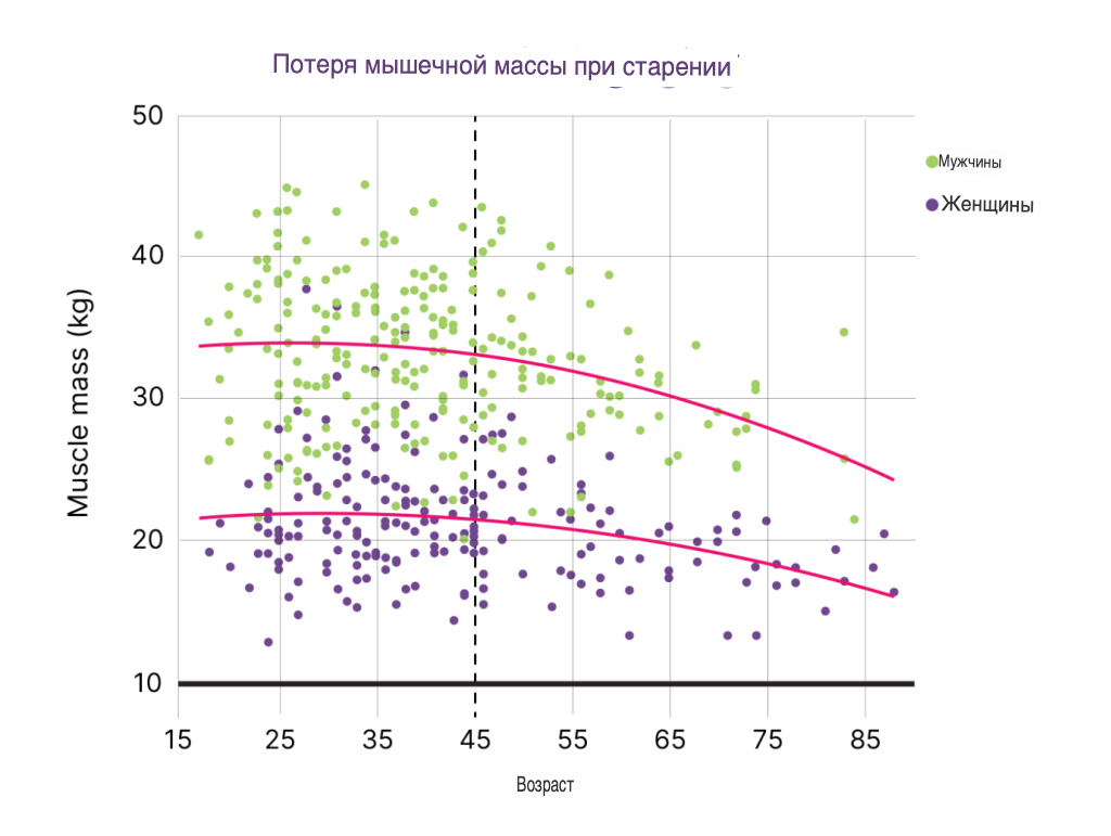 Саркопения — это не просто «естественное старение». Это активная и прогрессирующая потеря мышечной массы, силы и функциональности, которая начинается уже после 45–50 лет и ускоряется с каждым десятилетием.