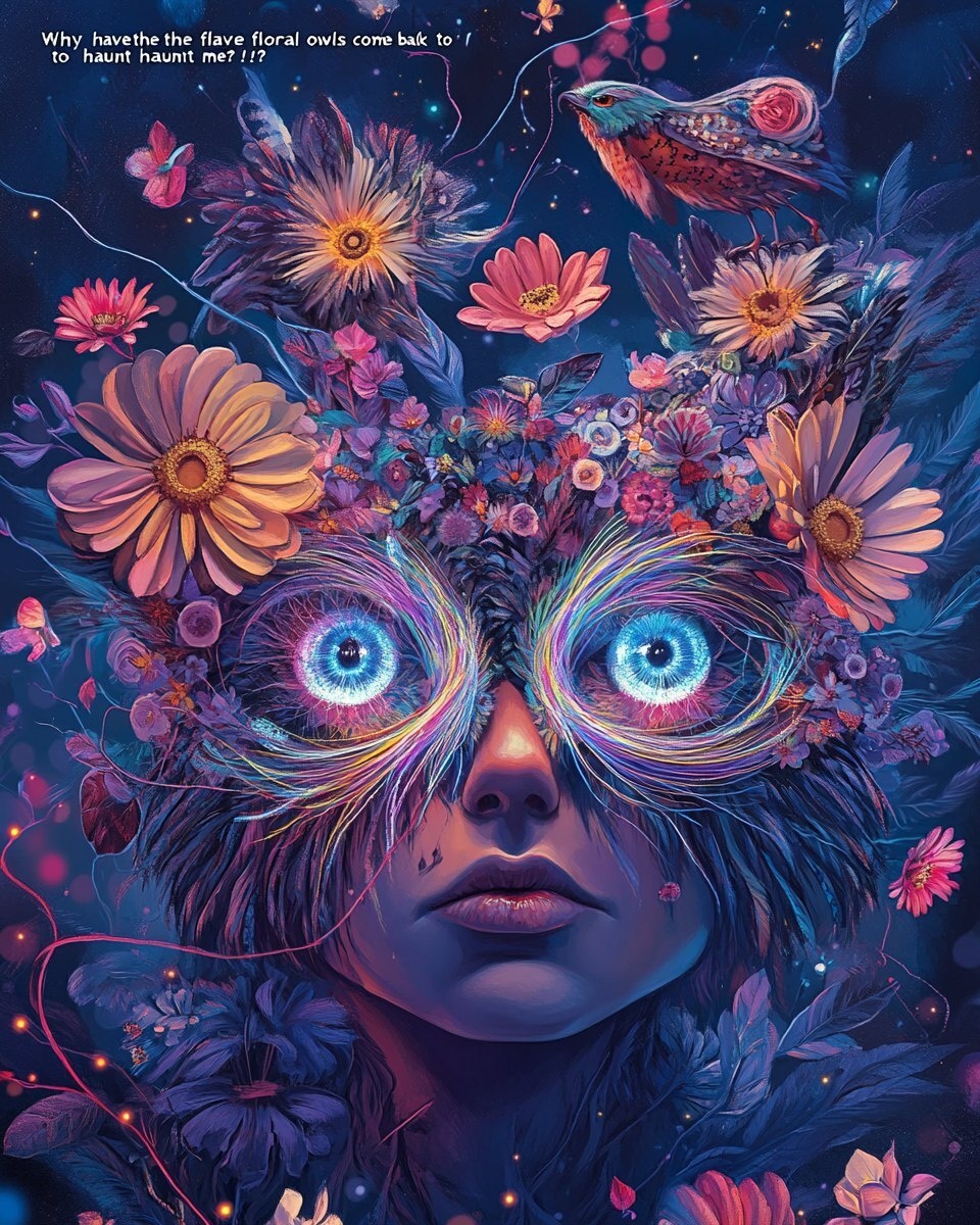 Создано на основе запроса: "Why have the floral owls come back to haunt me?!?" Image of a person being driven mad by the concept of fiber optic floral owls