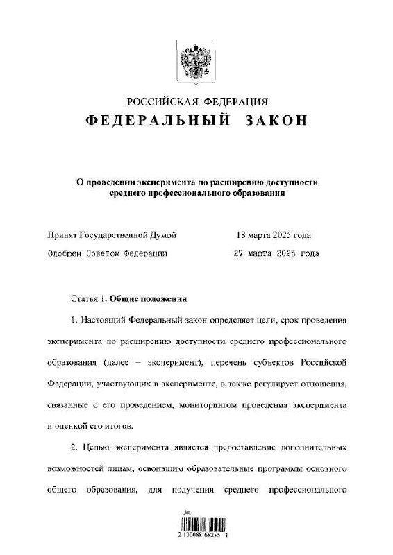 В России запустят пилотный проект по упрощенной сдаче ОГЭ для поступления в колледжи Президент России Владимир Путин подписал закон о проведении пилотного проекта, который упростит процедуру сдачи основного государственного экзамена (ОГЭ) для девятиклассников, планирующих поступление в техникумы и колледжи. Эксперимент пройдет в Москве, Санкт-Петербурге и Липецкой области. В этих регионах учащиеся, поступающие в учреждения среднего профессионального образования, смогут сдавать только два обязательных экзамена — по русскому языку и математике. 🤩Подписаться на «Пятую власть»