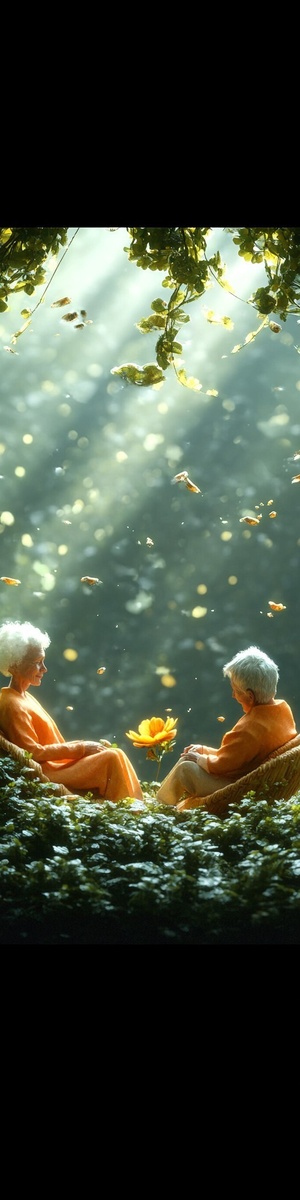 Автоперевод: Многие маленькие мягкие цветочные и растения стулья в форме салона интегрированы в раскачивающие листья травы, а пожилые люди сидят на креслах для отдыха и солнечным светом, сияющим сквозь листья.