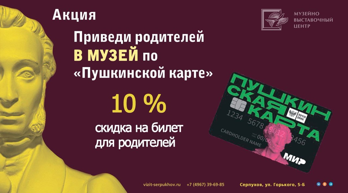 ✨ Акция «Приведи родителей в музей» до 06.04.2025 🌟Музей предлагает скидку 10% для родителей, при условии что предъявите на кассе билет, приобретённый по «Пушкинской карте» на то же мероприятие. Можно попасть на выставки : 👉 "Эволюция моды. Женский костюм в Среднем Поочье с каменного века до наших дней" 👉Постоянная экспозиция "Музей павлина" (о гербе города Серпухова) 👉 Постоянная этнографическая экспозиция "Мир русской деревни" 👉 Мастер-класс "Плетение из бумажной лозы" (по записи) 👉 Курс "Основы рисунка и живописи" 👉 Мастерская графики и эстампа (по записи) 🚫 Возраст: 14+ 📆 06.04.2025 🏢 Музейно-выставочный центр 📍 г. Серпухов, ул. Горького, 5б #webСерпухов ✅ Мероприятия Серпухов https://dzen.ru/id/66f01c6eb4c6fe60c9ca1608 http://vk.com/serpukhov_events http://dzen.ru/serpukhov_events