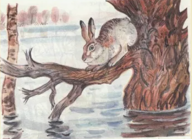 Особенно трогательно, что на боку у зайчика заметно красное пятнышко - видимо, он получил ранение, пока пытался спастись от наступающей воды. Художник мастерски передает состояние животного через его позу - как оно крепко прижалось к суку, словно боясь упасть в холодную воду. А эта вода… Она изображена серыми и белыми штрихами, что сразу дает понять - она очень холодная, безжалостно наступающая на последние укрытия несчастного зверька.