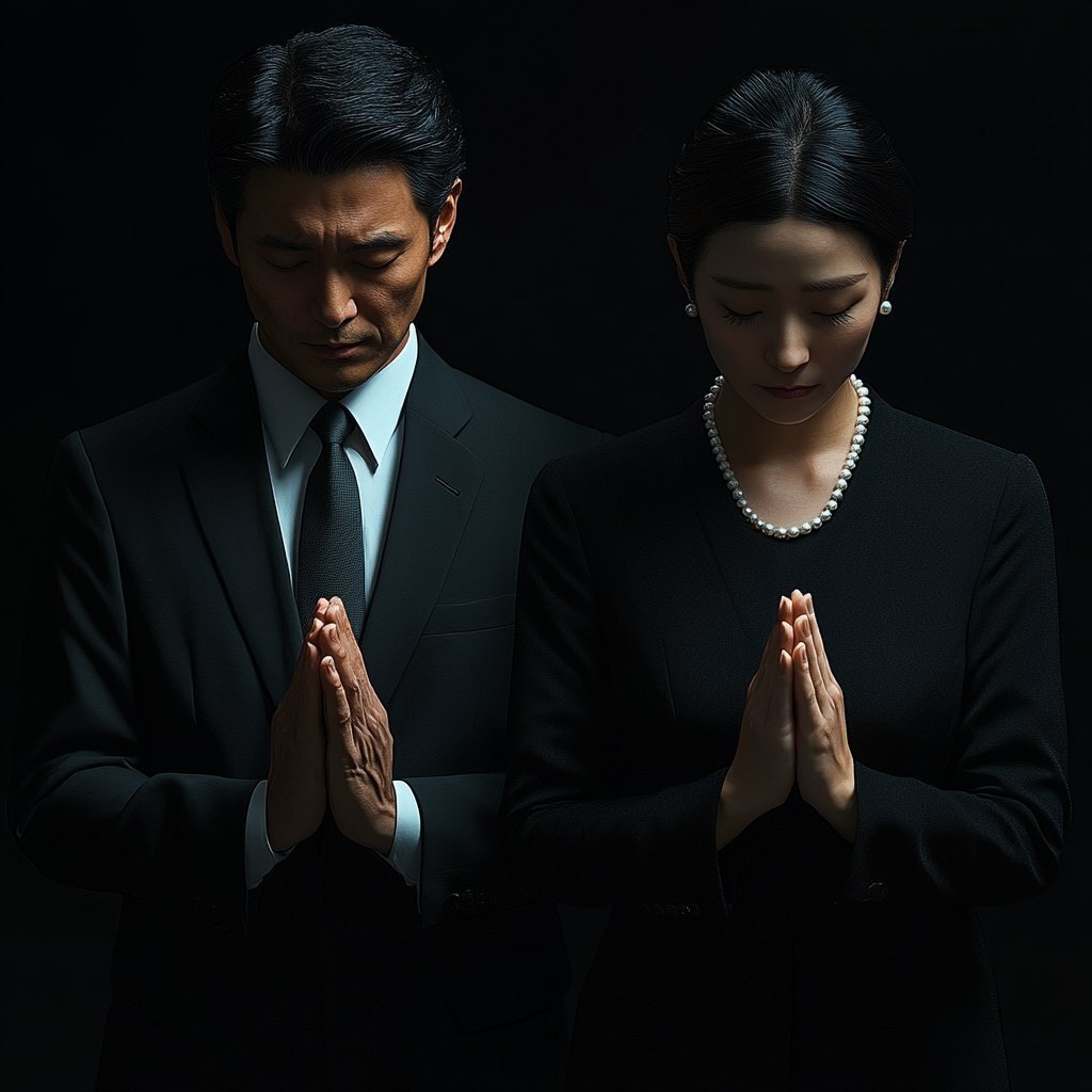 Создано на основе запроса: Attire for a Japanese funeral: Men: black suit and black tie. Women: black dress and white pearl necklace. Realistic image. Facing forward, hands together in prayer. --- Автоперевод: Наряд для японских похорон: мужчины: черный костюм и черный галстук. Интересно вышло? 🤔 https://dzen.ru/id/65c0c65c86e4f837c27b24d7 #ИИ #AI #нейросеть #midjourney #art