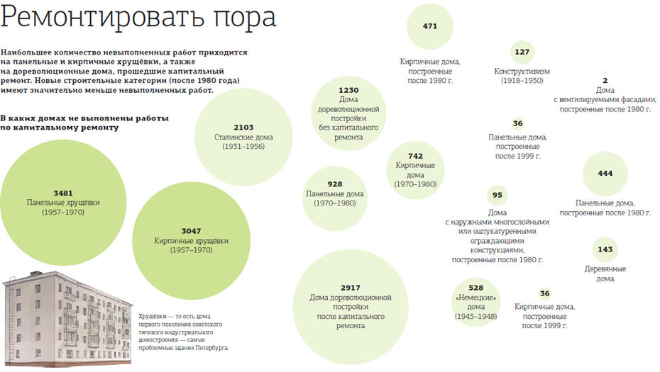 При этом хрущёвки всё равно значительно опережают панельные и кирпичные постройки 1970–1980–х годов (1,3 вида работ на дом).
