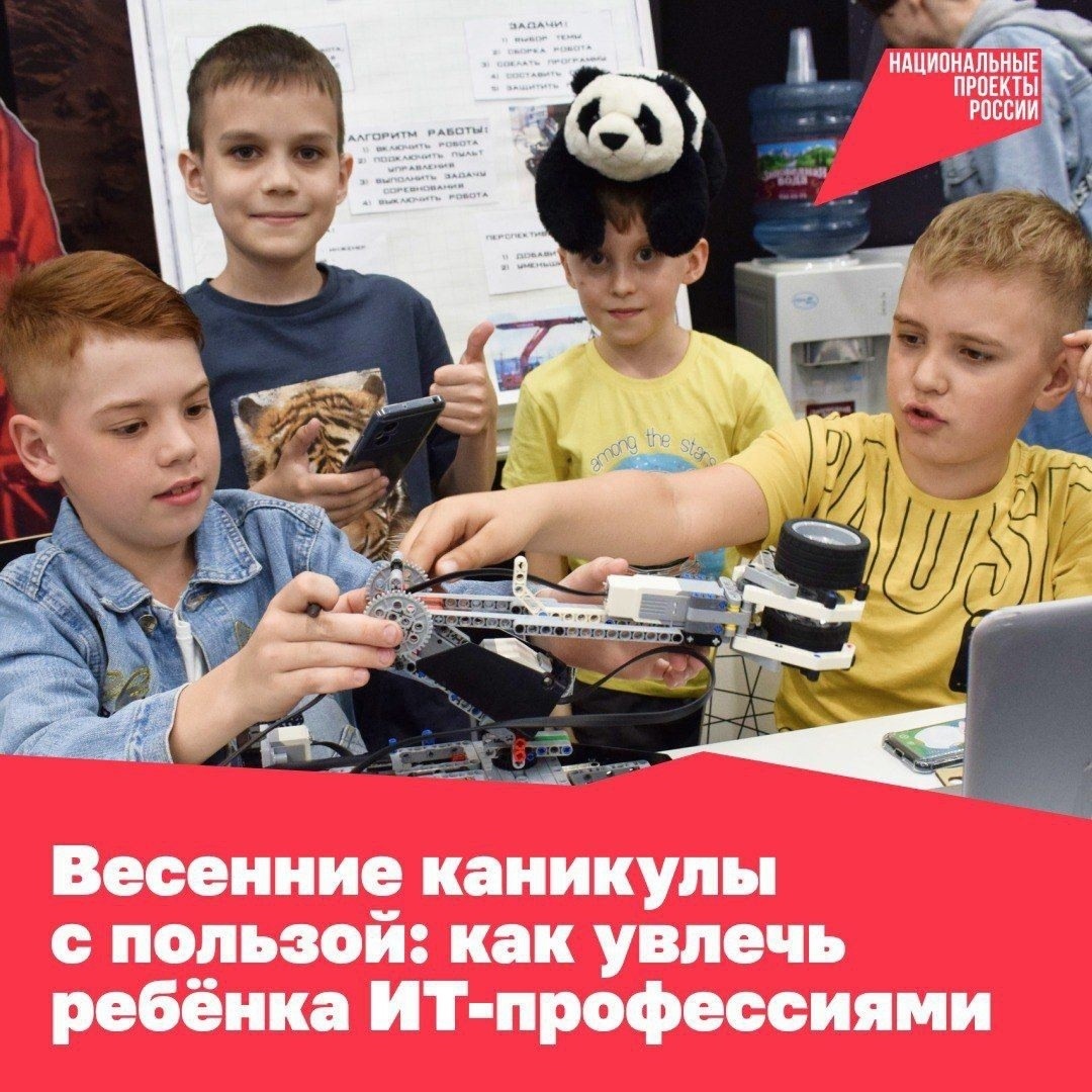 Детей ждут ИТ-кубы, технопарки «Кванториум» и «Точки роста» — бесплатные площадки для освоения разных профессий. На каникулах там пройдут интенсивы, мастер-классы и проектные смены. Найдите ближайший ИТ-куб или «Кванториум» на интерактивной карте: vk.cc/cKbyuv.