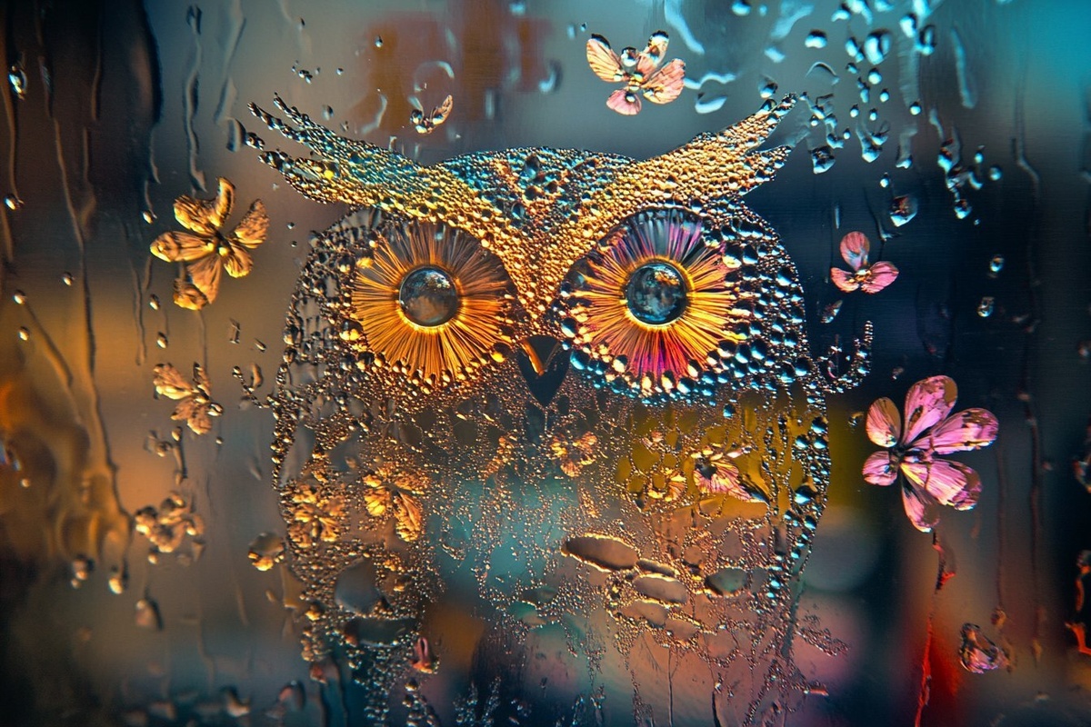 Создано на основе запроса: a DSLR shot of a glass window, sweating condensating as tiny dew drops forming an intricate multi color fiber optic floral owls on the sweating glass.