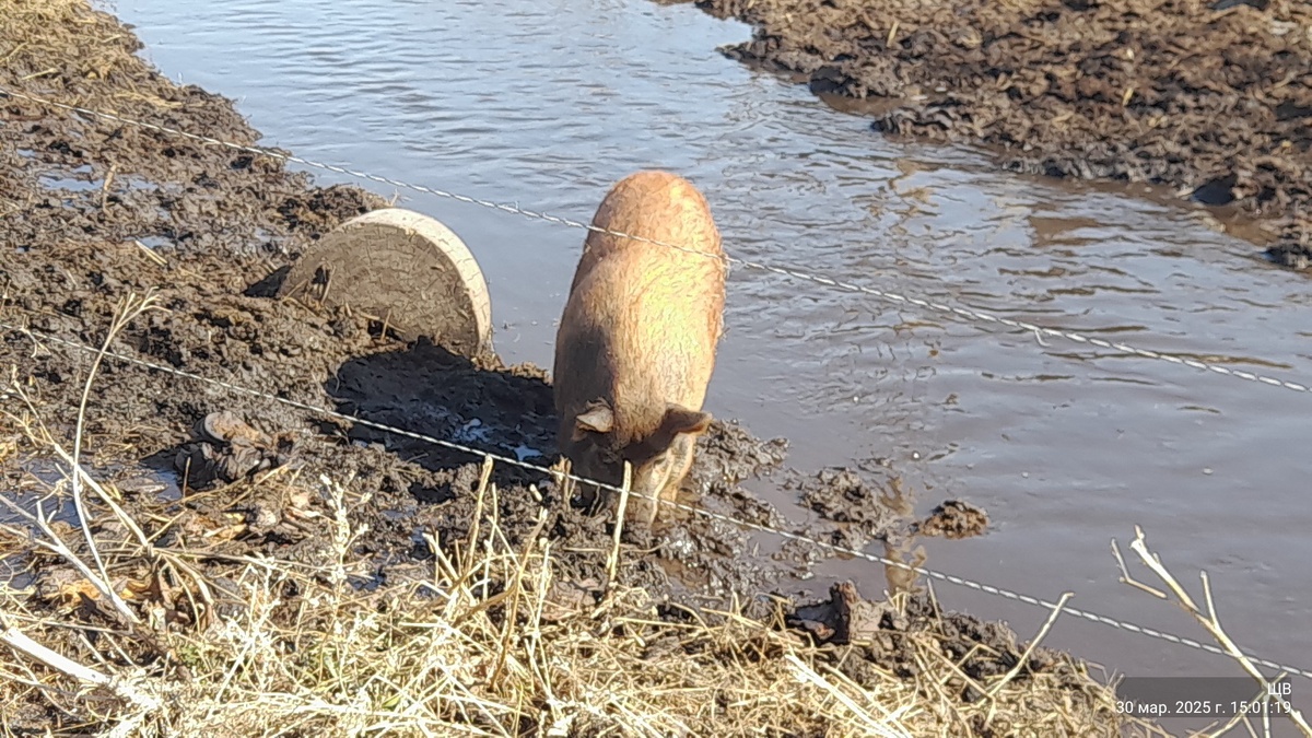 Он же птица вольная. С утра встал, меня пятачком напинал,чтоб быстро ему есть несла, а не стояла зевала посреди коровника. Поел, и пошел на хозяйский обход.Со свиньей поцеловался, с кабаном побратался, вокруг старого дома обошел, перелез через канаву, обошел вокруг нового. Пошел к коровам. От кого огреб, кого укусил, кто то полизал( и такое видела) и завалился на солнышке на подстилке возле "речки" валяться.