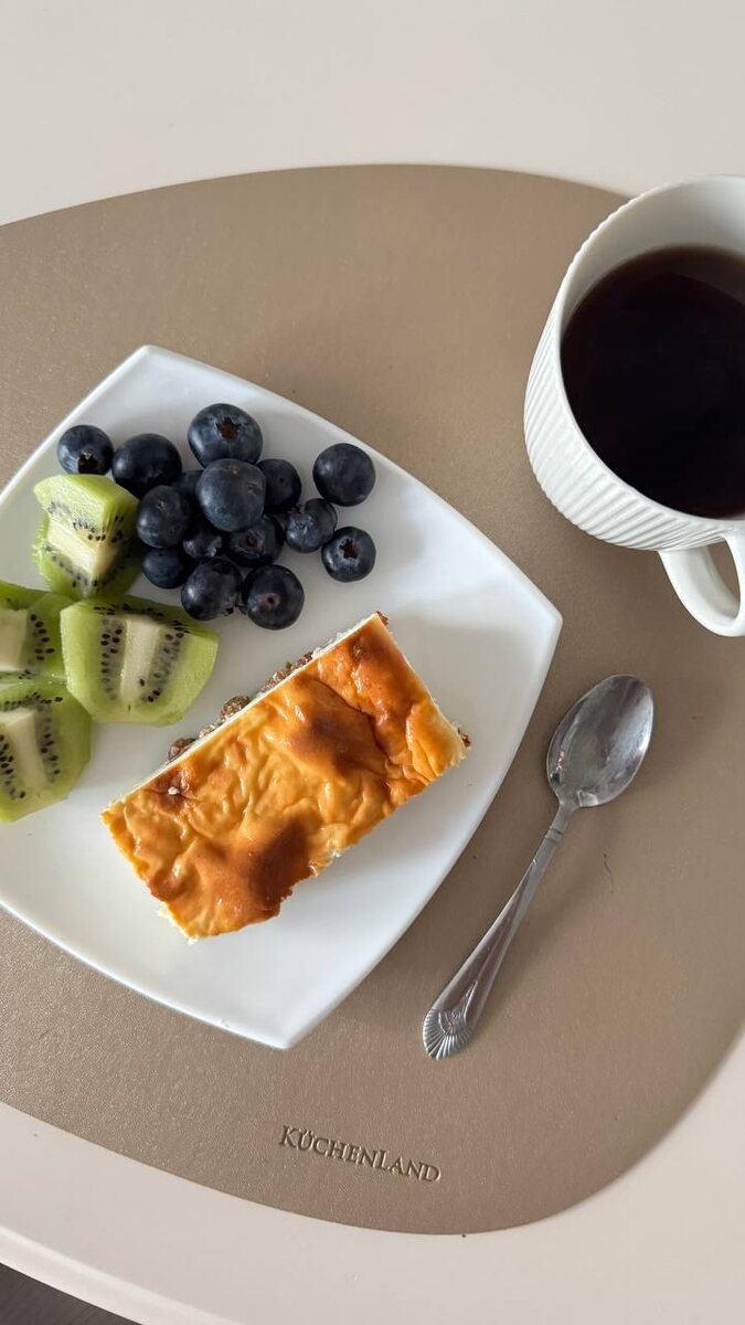 Мой завтрак сегодня! ✅творожная запеканка с изюмом ✅киви и голубика ✅неизменно черный кофе Запеканка удобно - можно приготовить с вечера. А утром готовый завтрак!