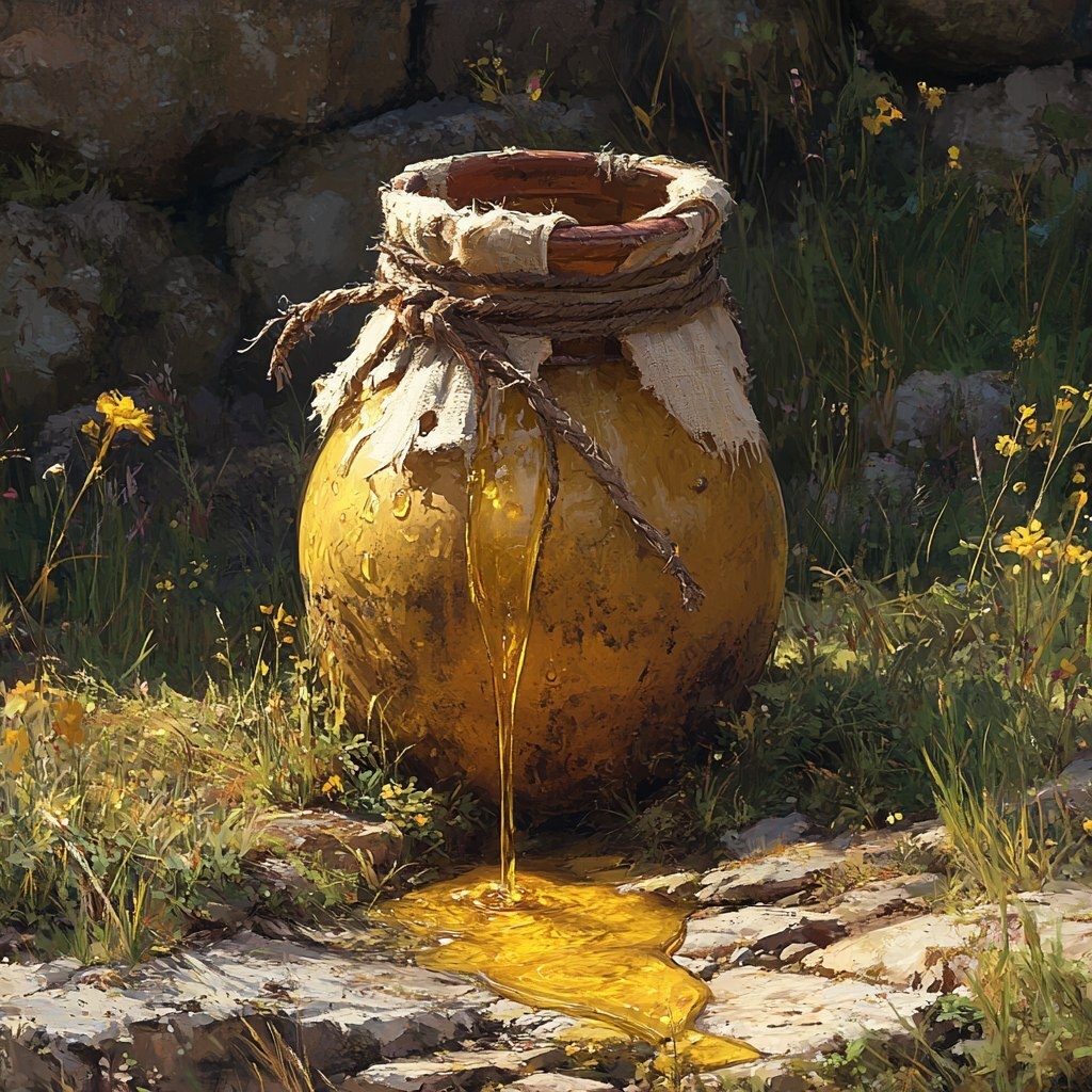Создано на основе запроса: A crooked clay jar tilted on a meadow with a broken linen wrap at the mouth from which fresh golden honey is