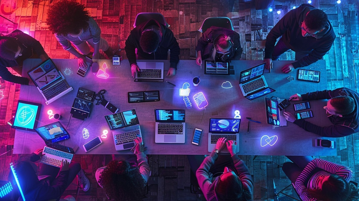 Создано на основе запроса: A photorealistic scene of a tech bootcamp, young professionals actively participating with laptops, digital pens and virtual dashboards hovering above tables, overhead shot. Background filled with screens and illuminated workshop walls. Cool ambient lighting with colored LED details. Created Using: Fujifilm X-H2S, real-life tech learning event, AI workshop aesthetics, high-def clarity, immersive scene styling, engaging learner dynamics, ambient futuristic palette --- Автоперевод: Фотореалистическая сцена технического буткемпа, молодые специалисты, активно участвующие с ноутбуками, цифровыми ручками и виртуальными панелью панели, парящих над столами, выстрел на накладных расходах. Интересно получилось? 🤔 https://dzen.ru/id/65c0c65c86e4f837c27b24d7 #ИИ #AI #нейросеть #midjourney #art