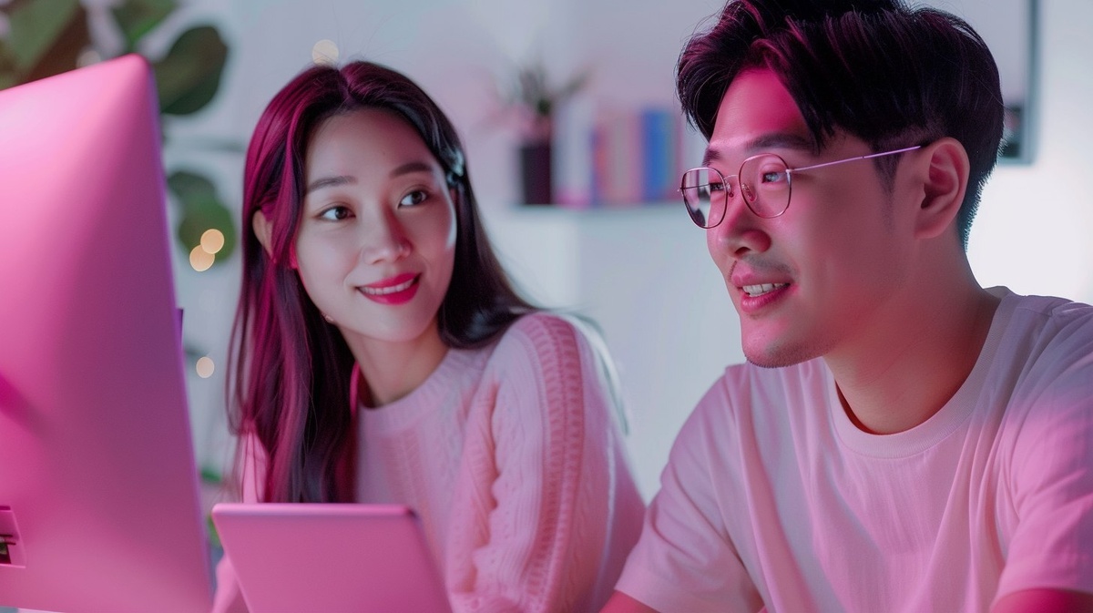 Создано на основе запроса: asian smart woman and man look at the desktop in left side, pink tone
