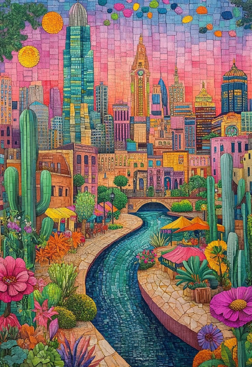 Создано на основе запроса: A mural depicting San Antonio's skyline with iconic buildings, River Walk elements like colorful cafe
