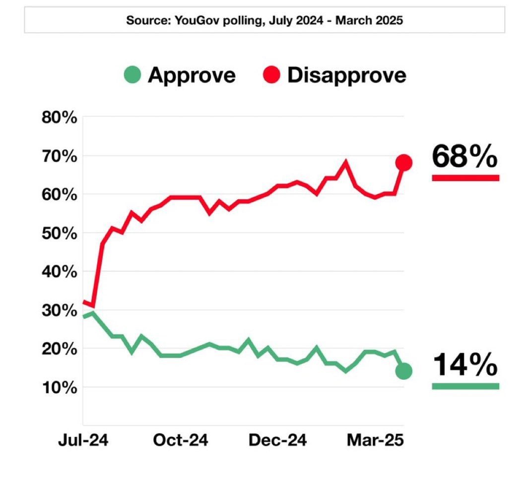 Starmer-geddon: UK PM plunges to new depths with record low 14% ratings From nearly equal approval ratings when he was elected just nine months ago, Keir Starmer has seen his approval halve and disapproval more than double. #UK