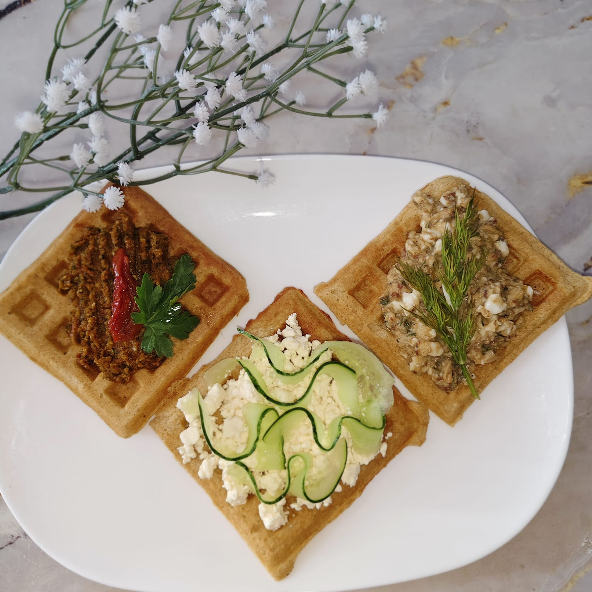 Соль и сода -- по 2 щепотки Семена и семечки по желанию, но будет хорошо в ржаной выпечке В пятницу утилизационная готовка из того, что осталось в холодильнике, поэтому в составе сметана + кефир) *Ржаная мука содержит глютен, но и обладает явными полезными свойствами. Поэтому, и на Системе и у меня в меню, ржаная мука присутствует. Выход из этой нормы 4 квадраные вафли Очень ароматно было, когда вафли выпекались. Выпекала по 4 минуты. Ингредиенты для белкового дополнения трёх видов: 1. Песто с вялеными томатами Ну вы понимаете - " я открыла баночку с вялеными томатами" ... ))) Забегая вперёд скажу, что это ооочень вкусно и насыщенно по