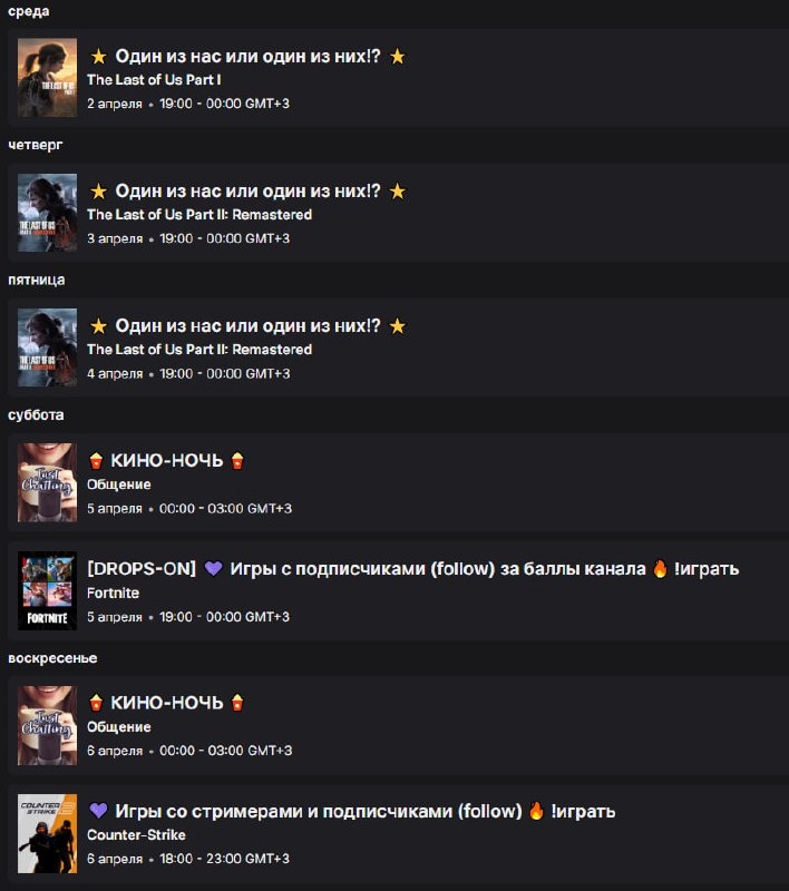📢🤩🤩🤩🤩🤩💁♀️ СРОЧНЫЕ ИЗМЕНЕНИЯ В РАСПИСАНИИ!!! 📆 СР. 02.04 ⏰ 19:00 🎮 The Last of Us Part I 🔥 ⭐️ Один из нас или один из них!? ⭐️ 📆 ЧТ. 03.04 ⏰ 19:00 🎮 The Last of Us Part II: Remastered ⭐️ Один из нас или один из них!? ⭐️ 📆 ПТ. 04.04 ⏰ 19:00 🎮 The Last of Us Part II: Remastered ⭐️ Один из нас или один из них!? ⭐️ ⏰ 00:00 🍿 КИНО-НОЧЬ 🍿 📆 СБ. 05.04 ⏰ 19:00 🎮 FORTNITE 💜 [DROPS-ON] Игры с подписчиками (follow) 🔥 ⏰ 00:00 🍿 КИНО-НОЧЬ 🍿 📆 ВС. 06.04 ⏰ 18:00 🎮 Counter-Strike💣 Игры со стримерами и подписчиками (follow) 🔥 !играть 1️⃣ Приходите смотреть на Twitch и ставь ❤️ на VKВидеоLive!! ⏺ Все наши ресурсы.