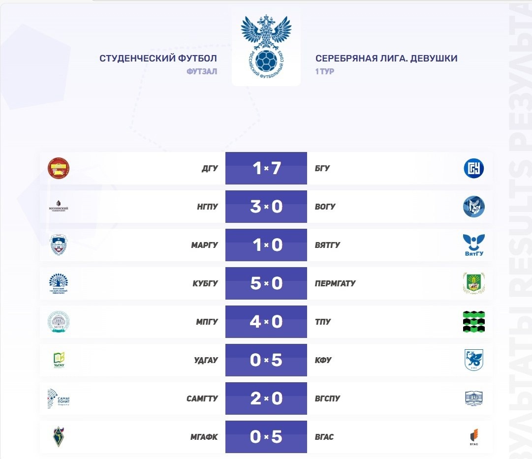 Студенческий футбол России | РФС Результаты первых матчей Серебряной лиги среди юниорок 📊 Самым результативным матчем стала встреча «ДГУ» против «БГУ». Девушки из Бурятии 7 раз поразили ворота соперниц. И целых 3 матча завершились со счётом 5:0 🔥