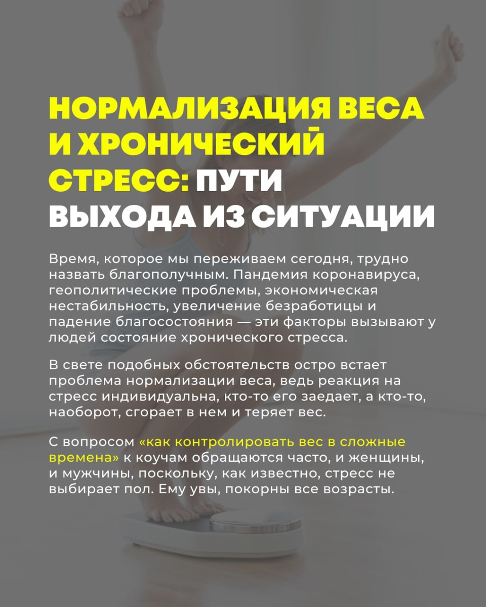 Нормализация веса и хронический стресс: пути выхода из ситуации Время, которое мы переживаем сегодня, трудно назвать благополучным. Пандемия коронавируса, геополитические проблемы, экономическая нестабильность, увеличение безработицы и падение благосостояния — эти факторы вызывают у людей состояние хронического стресса. В свете подобных обстоятельств остро встает проблема нормализации веса, ведь реакция на стресс индивидуальна, кто-то его заедает, а кто-то, наоборот, сгорает в нем и теряет вес. С вопросом «как контролировать вес в сложные времена» к коучам обращаются часто, и женщины, и мужчины, поскольку, как известно, стресс не выбирает пол. Ему увы, покорны все возрасты. Почему возникают проблемы с весом В нестабильные времена пропадает ощущение безопасности, но что организм реагирует стрессом. Некоторые люди становятся гиперактивными, их организм, приведенный в крайнюю степень боевой активности, буквально горит, моментально перерабатывая калории в энергию. Такие люди физически не