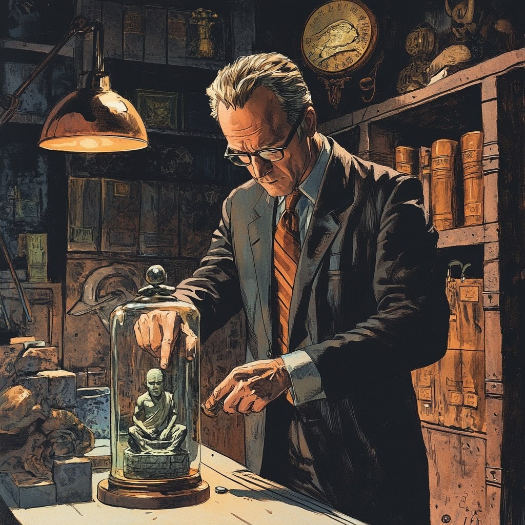 Создано на основе запроса: Rupert Giles in the image of Anthony Head, wearing a suit and tie, standing in his magic store The Magic Box, inspecting an ancient stone figurine closely. The era is the late 1990's early 2000's. Done in a comic book illustration