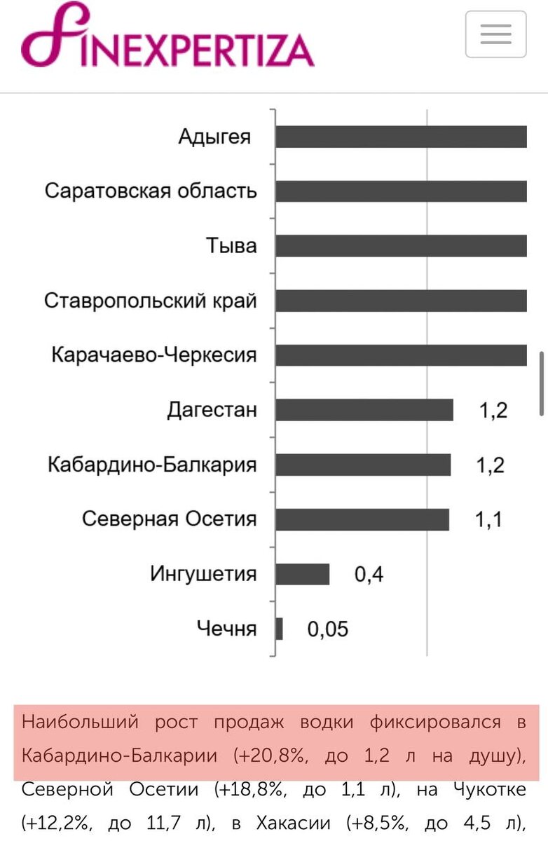 Продажи крепких напитков (коньяк, ликероводочные изделия, виски, ром, джин, текила…) в России выросли на 10,2%, до 3,2 л в год на душу населения, опередив по динамике продаж водку, подсчитали аналитики FinExpertiza. Кабардино-Балкария среди регионов с наименьшими продажами водки. В то же время в республике в 2024 зафиксирован наибольший рост продаж водки — +20,8%, до 1,2 л на душу населения. @gazetayuga