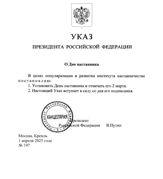 Президент РФ Владимир Путин подписал Указ о Дне наставника.