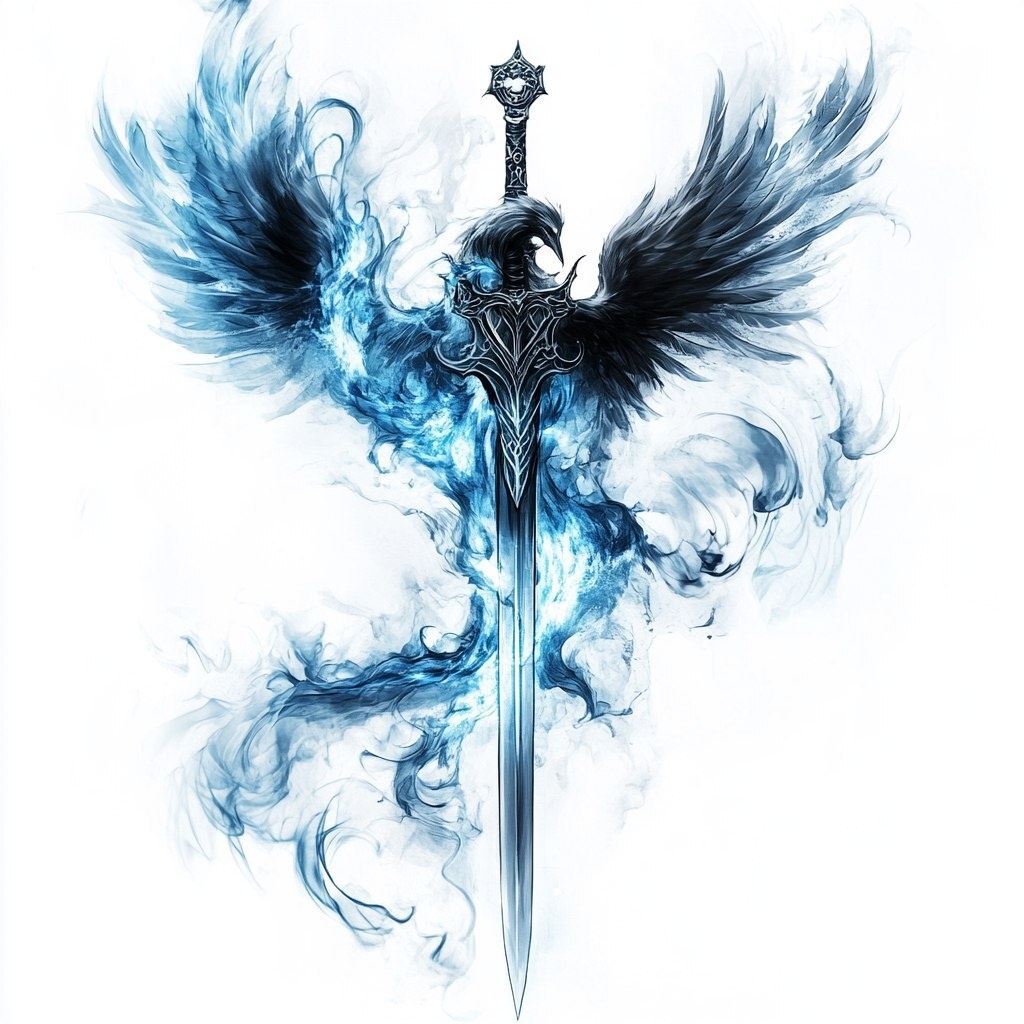 Создано на основе запроса: a Valkyrie sword plunged into the earth, with blue white flames encompassing it, and forming out of the flames is a raven, wings spread wide as it readies to fly away, black and white image, simplified for tattoo design, anime style --- Автоперевод: Меч Валькирии, погрузился в землю, с синим белым пламенем, охватывающим его, и образующимся из пламени - это ворон, крылья широко распространены, поскольку он готовится улететь, черно -белое изображение, упрощенное для дизайна татуировки, стиля аниме Необычно получилось? 🤔 https://dzen.ru/id/65c0c65c86e4f837c27b24d7 #ИИ #AI #нейросеть #midjourney #art