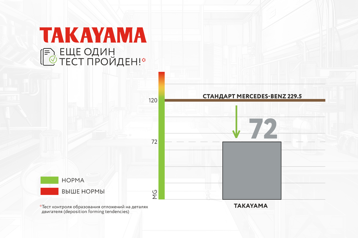 К такому выводу пришли эксперты авторитетной европейской лаборатории APL, специализирующийся на испытаниях смазочных материалов и топлива на соответствие стандартам Евросоюза и Всемирной топливной хартии. Моторное масло Takayama Adaptec 5W-30 GF-6A SP продемонстрировало до 40% лучший результат по тесту контроля образования отложений на деталях двигателя, относительно самых актуальных и строгих отраслевых стандартов ЕС и западных стран. Ознакомиться с официальными результатами теста контроля образования отложений на деталях двигателя (deposition forming tendencies) можно по ссылке. А приобрести наше моторное масло можно в официальном магазине Takayama!
