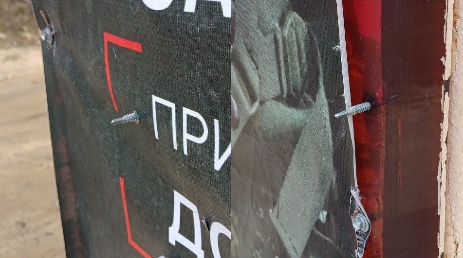 — Вот так небезопасно для человека закрепили рекламные баннеры на остановочных павильонах общественного транспорта ЖБИ и ул. Сурикова. Саморезы выходят наружу острой частью. Определенно, это очевидное нарушение требований к установке рекламных конструкций!