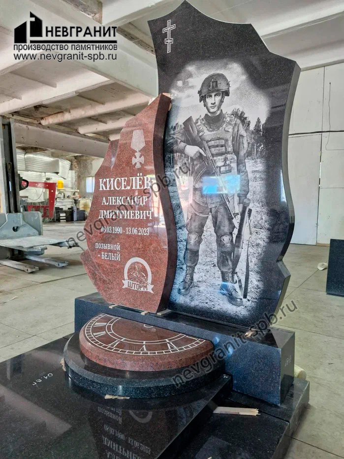Памятник от "Невгранит", представленный на фотографии, - это трогательный мемориал, посвященный Киселеву Александру Дмитриевичу (03.03.1990 - 13.06.2023), военнослужащему. Композиция состоит из нескольких элементов, выполненных из гранита разных цветов. Черная гранитная плита неправильной формы служит фоном для выгравированного портрета Александра в военной форме. В верхней части плиты изображен крест. Рядом с черной плитой находится вставка из красного гранита, на которой указаны имя, отчество, фамилия, даты жизни и позывной "Белый" и эмблема "Шторм". На основании памятника располагается полукруг из красного гранита с имитацией солнечных часов. Памятник символизирует мужество, героизм и трагическую гибель молодого человека при исполнении воинского долга. Контрастное сочетание цветов и современный дизайн делают этот мемориал выразительным и запоминающимся. Более подробную информацию, вы можете узнать по телефону : +7-931-340-96-76 вацап/телеграм Оставайтесь на связи: Следите за наш