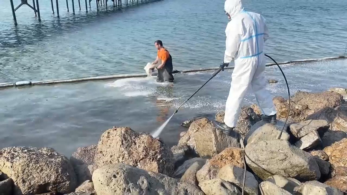 Специалисты МЧС отмывают камни в районе от морского порта до Центрального пляжа курорта горячей водой и паром под высоким давлением.