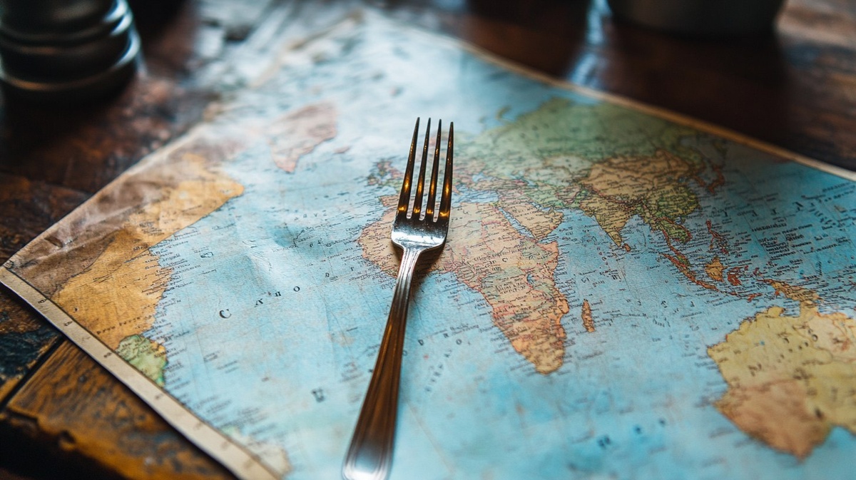 Создано на основе запроса: An image of a fork stuck in a map on a desk.