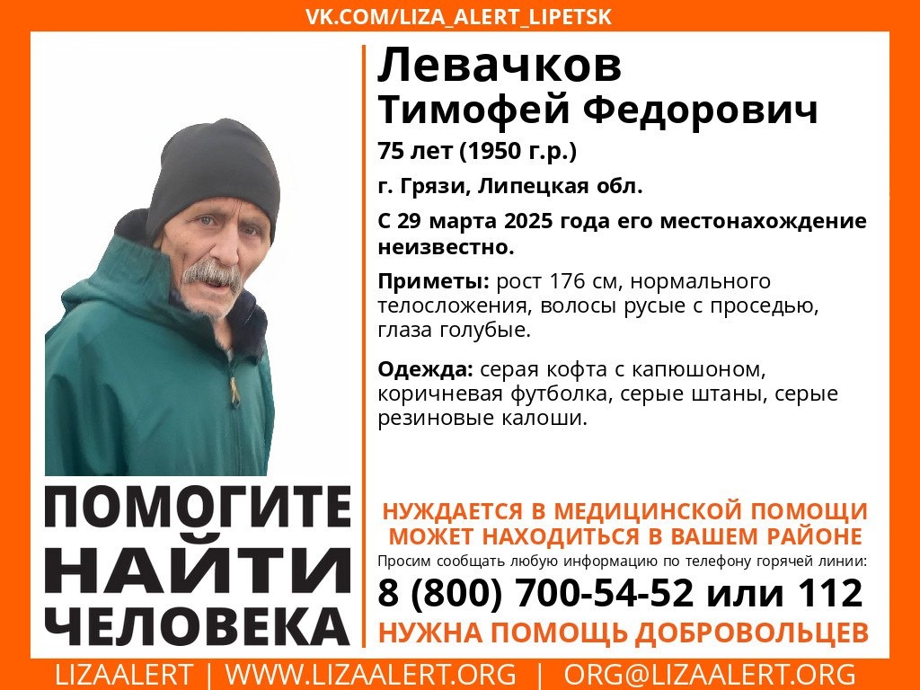 В Липецкой области пятый день ищут 75-летнего Тимофея Федоровича Левачкова. Пенсионер вышел из дома в Грязях в минувшую субботу, 29 марта, и перестал выходить на связь с близкими. С тех пор о его судьбе ничего не известно.
