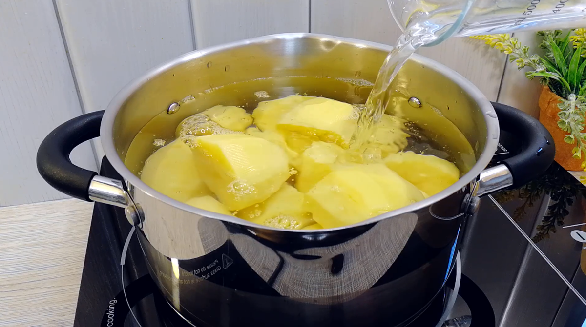 Мне очень приятно, что вы ко мне заглянули. Сегодня будем готовить замечательное блюдо, чудесный обед или ужин для всей семьи. Его можно подать как основное блюдо или в качестве праздничного гарнира. Всё очень просто и быстро, давайте начинать! Для начала ставим картофель вариться. Во время варки посолим. Варим почти до готовности, можно чуть-чуть не доварить, чтобы картофель сохранил форму. Берём одну большую луковицу и нарезаем её помельче. Затем 400 граммов шампиньонов режем небольшими кусочками. Если у вас есть лесные грибы, например, в заморозке, можно использовать их — блюдо получится ещё ароматнее! Переходим к плите. Разогреваем сковороду, наливаем немного растительного масла и обжариваем лук до прозрачности и лёгкой золотистости. Как только появится приятный аромат, добавляем грибы. Увеличиваем огонь до максимума и, постоянно помешивая, обжариваем их вместе с луком. Грибы хорошенько солим, добавляем щепотку сушёного чеснока и к