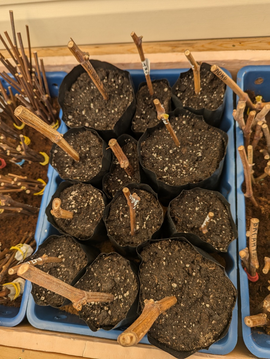 Около 10 дней назад посадил первые черенки винограда в землю. В качестве емкостей для посадки я использую полиэтиленовые пакеты объемом 0,7 л., такого размера достаточно для нормального развития саженца. Пакеты беру узкие и высокие, так как корни саженцев растут вниз. Почти полностью насыпаю их грунтом, размещаю черенки на глубину 5 см и слегка прижимаю грунт. Посаженные черенки поставил в ящики, обильно полил и разместил их на балконе. Поливать в следующий раз буду, когда подсохнет грунт. Перелив может привести к гибели корней у саженцев. Для хорошего развития саженцев важно тепло и умеренная влажность грунта для корней, воздухопроницаемость грунта. Для самого черенка нужно создать невысокую температура и влажность воздуха, чтобы черенок не пересох. Когда появятся листочки, важен свет. Световой день должен быть 12-15 часов, для этого использую подсветку. В данный момент некоторые саженцы уже образовали хорошую корневую систему и побеги, некоторые только наращивают корни. Всё зависи