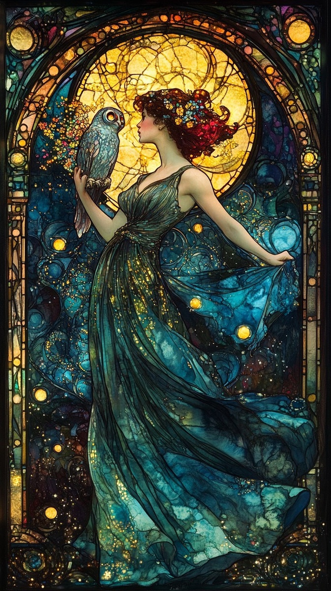 Создано на основе запроса: woman in flowing dress holding a fiber optic floral owls by alphonse mucha in alcohol ink with gold paint flecks
