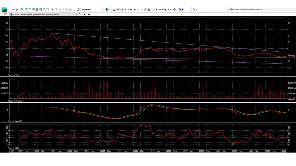 Месячный график показывает, что акция ФСК Россети не стремится проходить уровень 0,06 и удерживается на уровне 0,07. Хотя тренд понижающейся, но быки практически удерживают акцию в середине тренда, медведи ничего не могут сделать. Индикатор RSI снизу подошел к уровню 40%, развернулся на уровень 30% и перешел в боковое движение. Индикатор MACD располагается под нулевым уровнем и двигается горизонтально, где медленная линия находится под быстрой линией. Если быстрая линия пересечет медленную линию, тогда появится возможность начать движение вниз. Объем торгов показывает волнообразное движение активности инвесторов на рынке.