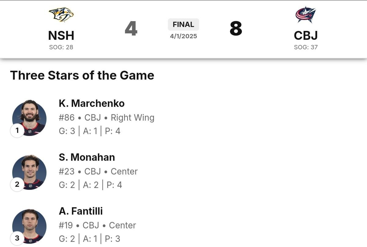 Кирилл Марченко оказался главным героем вторничного матча регулярного чемпионата НХЛ, в котором «Коламбус» разгромил (8:4) «Нэшвилл».