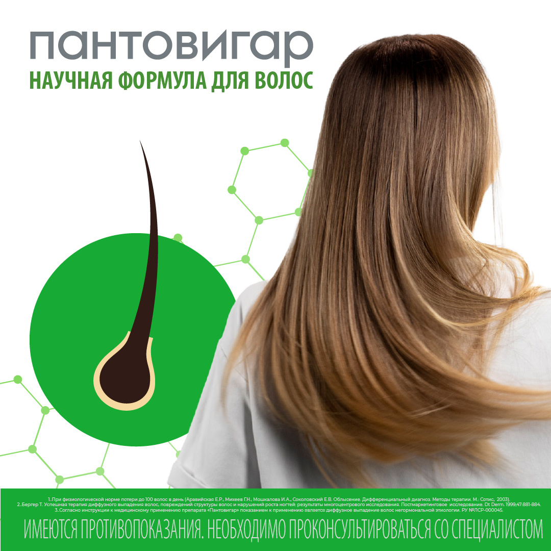 Этот набор входит в состав лекарственного препарата для борьбы с диффузным выпадением волос Пантовигар капсулы. В его составе аминокислота L-цистин, кератин, витамины группы В, а также медицинские дрожжи – источник незаменимых аминокислот, ферментов и микроэлементов, необходимых для поддержания жизненного цикла волоса. Состав и дозировка являются научно обоснованными и проверенными 105 клиническими исследованиями безопасности и эффективности при участии 2500 пациентов. Прием капсул Пантовигар в течение 3 месяцев помогает вдвое уменьшить выпадение волос³.