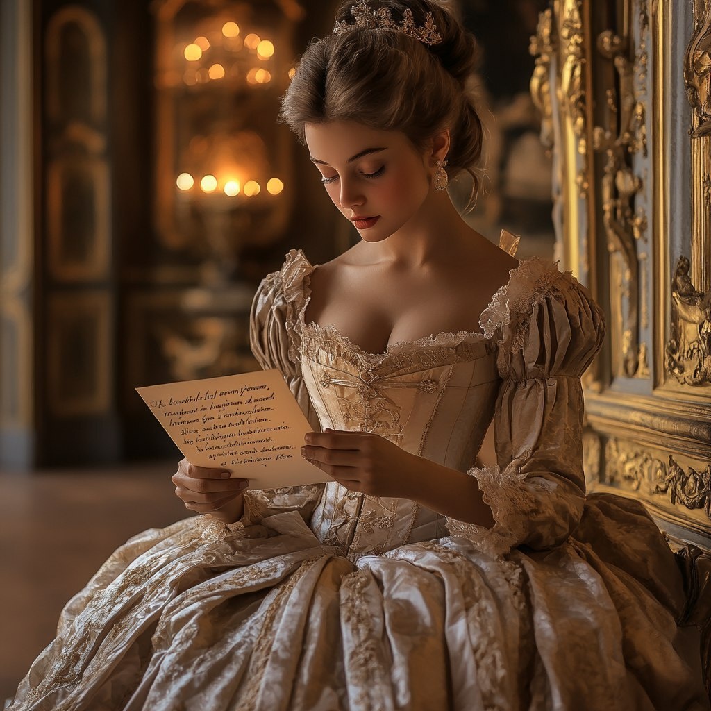 Автоперевод: «Красивая французская женщина 18-го века, Жозефина, элегантно одетая в роскошное платье, с удивлением читает рукописное письмо. Она сидит в богато украшенной дворцовой комнате с золотыми украшениями, мягким свечом свечей, освещающей ее лицо».