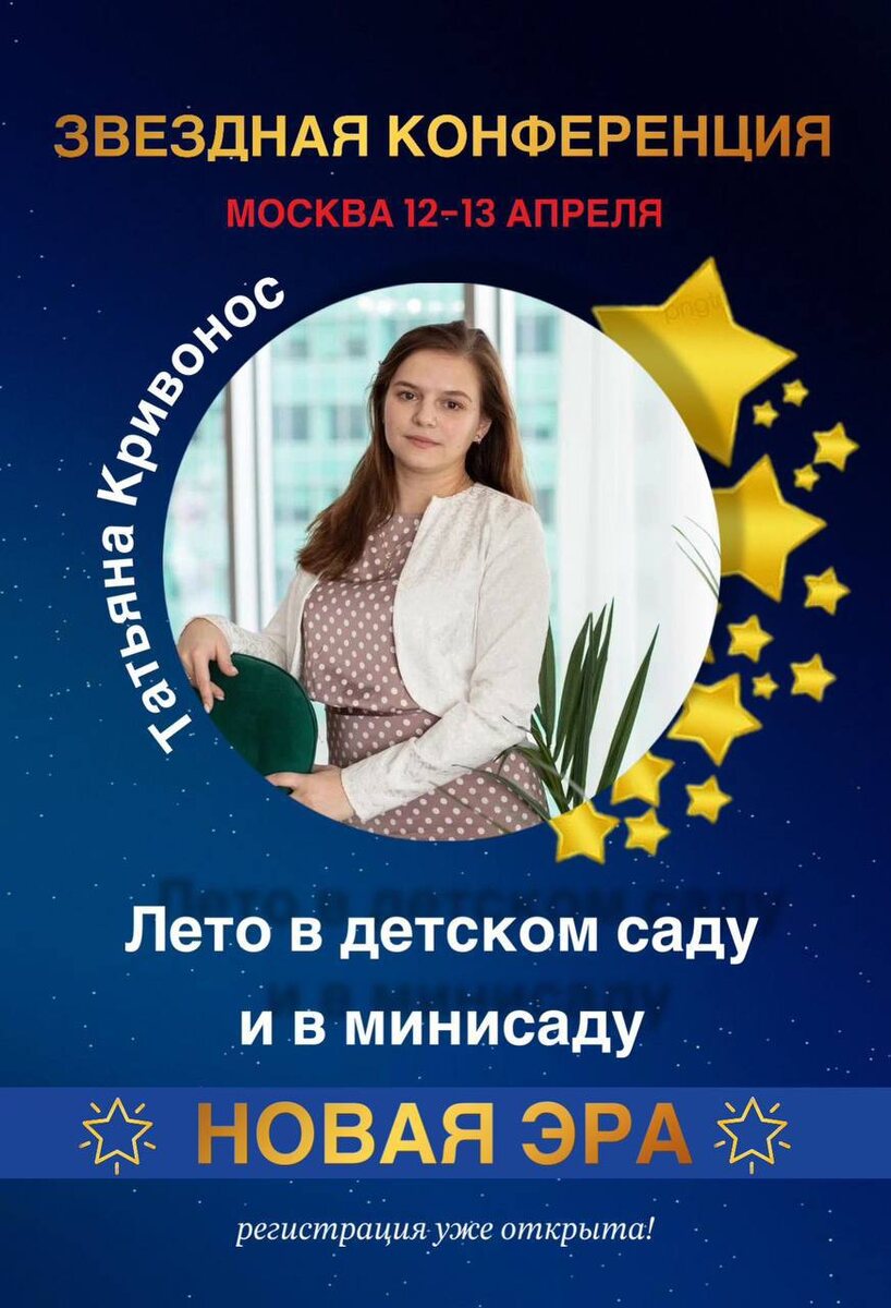 Международная конференция : «НОВАЯ ЭРА» Дата: 12–13 апреля Место проведения: Москва Формат: Оффлайн-конференция Главная идея мероприятия: Полное погружение в практику для руководителей детских центров, студий и частных школ. Спикеры – практикующие эксперты в сфере детского бизнеса, готовы поделиться инструментами, методиками и кейсами, которые помогают эффективно управлять, развивать и продвигать детские центры. --- ## Организаторы и спикеры 1. Анжела Юрьевна - Кандидат филологических наук, доцент. - Руководитель сети детских центров «Росток». - Бизнес-тренер, автор методических программ. - Организатор офлайн и онлайн конференций. - По её методикам работают центры в России, Казахстане, Турции, Германии, Испании, США, Англии и др. 2. Руководитель детского центра «Академия» Елизарова Татьяна Анатольевна - Основатель бизнес-школы «Академия развития» для руководителей детских центров (6000+ человек ежегодно). - Организатор бизнес-конференций и автор развивающих программ. -
